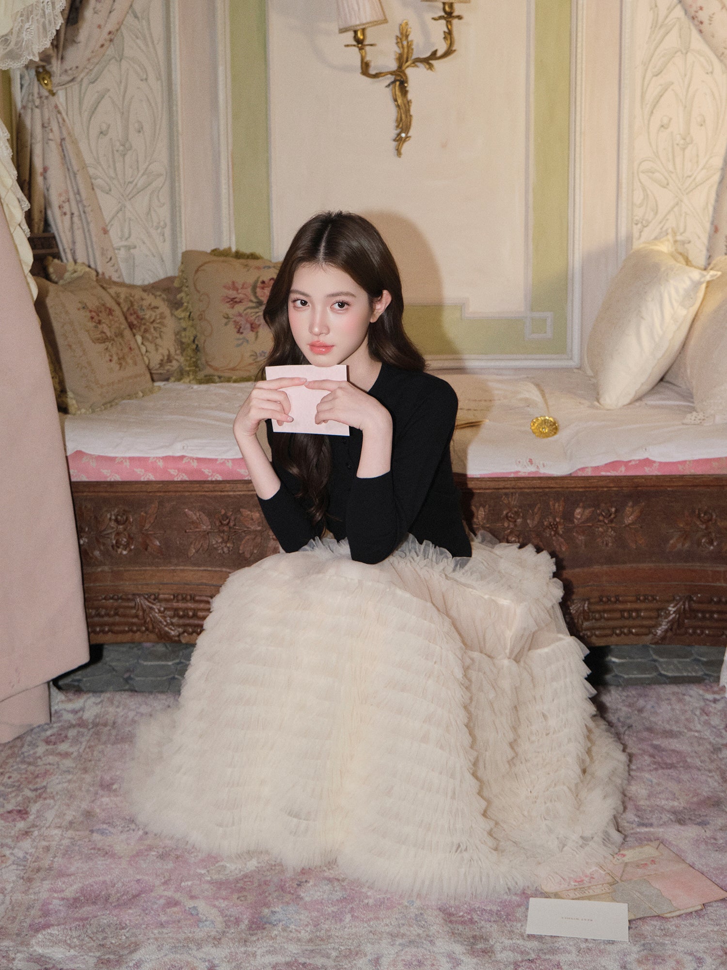 3D rose pleated camisole can be worn alone or with a slim-fit Eggka Cardigan -